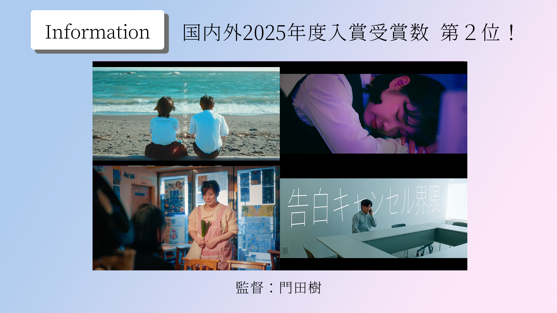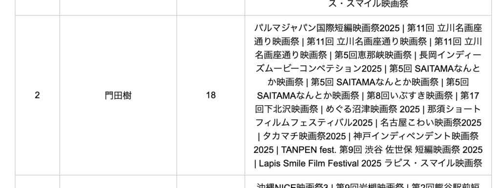 日本の映画祭情報を掲載するサイト、ファインディングシネフェスにて、2025年度の国内外映画祭で受賞ランキングを掲出しており、監督門田がなんと第2位となりました。